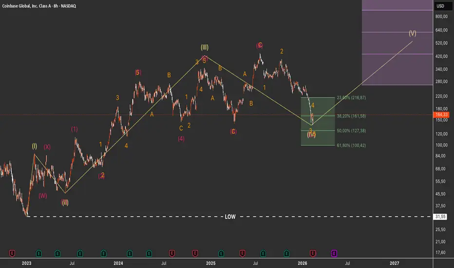 Die Aktie von Coinbase befindet sich aktuell nach meiner Einschätzung in einer übergeordneten Welle (4), die als korrektive Phase innerhalb eines laufenden Impulses zu interpretieren ist.