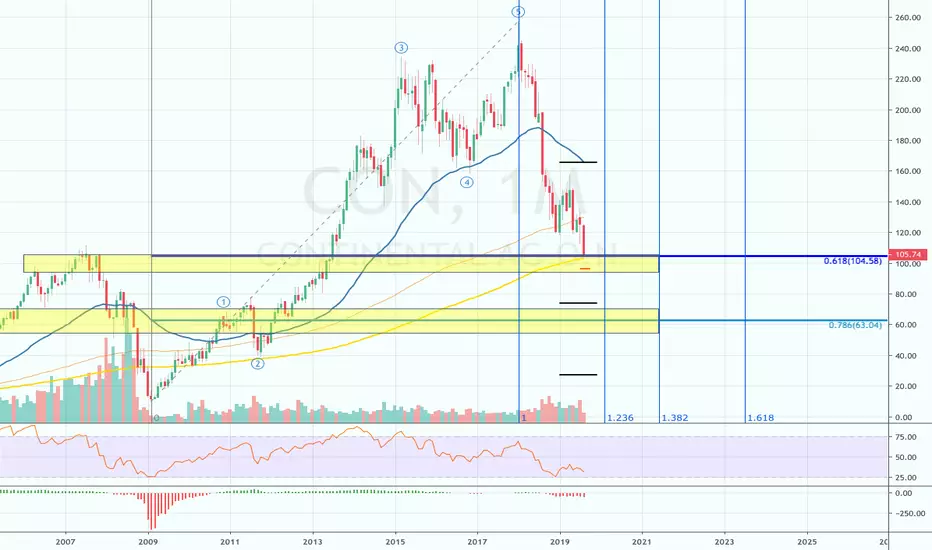 Die Continental AG hat seit dem Hoch vom Januar 2018 bis heute im August 2019 ca. 60% Kursverlust zu verzeichnen und befindet sich kurz vor dem 61,8er Rücklauf der Aufwärtsbewegung von 2009 - 2018.