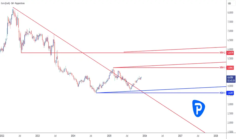herzlich Willkommen zu einem kompakten Update zum MAIS (CORN CFD) von Pepperstone. Ich analysiere den Kontrakt auf Wochenbasis.