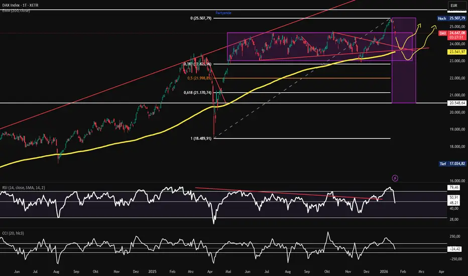 Ich sehe einen unterstützenden Bereich bei 23680 (vom Hoch ca. -7%) und danach die 23000 Punkte (vom Hoch ca. -10%). Das wären für mich die beiden normalen Anlaufstationen und würden mich auch nicht beunruhigen.