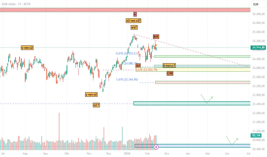 Im DAX befinden wir uns meiner Ansicht nach weiterhin in der übergeordneten Korrektur seit dem April‑25‑„Hammer‑Spike“ nach unten. Dieser Spike markierte für mich die rote A. Anschließend haben wir eine recht ausgedehnte Korrekturstruktur ausgebildet, die ich als W‑X‑Y‑X2 abgeschlossen sehe.