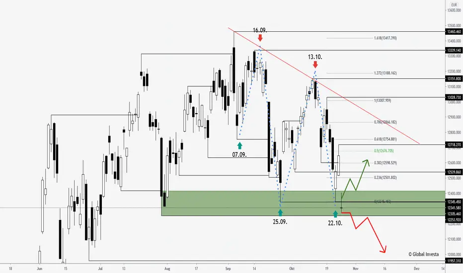 Nach dem vorangegangenem Abwärtsimpuls mit Tief am 22.10. erholte sich der deutsche Leitindex bis 12718 Punkten, was bereits dem Reaktionsausmaß einer Maximalkorrektur entspricht. Diesen Bereich hatten wir als kritisch beschrieben und unsere Abonnenten am 23.10. auf einen möglichen Rückgang hingewiesen.