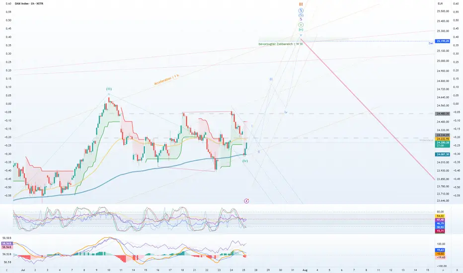 Die Welle (v) von V von (V) von ⑤ von III zeigt im Stundenchart einen finalen Schub in Richtung 25.199 Punkte. Dieser Bereich stellt den bevorzugten Zielbereich dar, in dem sich mehrere Fibonacci-Projektionen und diagonale Schnittpunkte überschneiden.