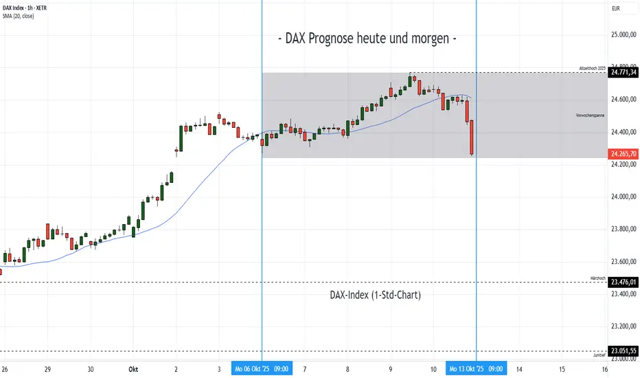 Abhängig vom Wochenstart könnte der DAX am Dienstag zunächst um die psychologisch wichtige 24.000er-Marke ringen und in eine Stabilisierungsphase übergehen. Primär ist zwischen 23.400 und 24.800 Punkten eine Seitwärtsphase aktiv.