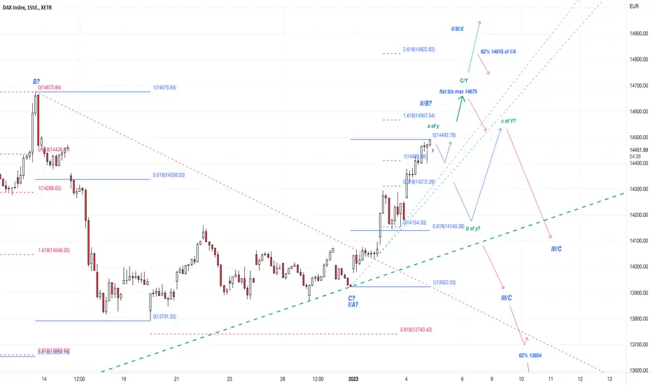 Wie der Chart zeigt, gibt es aber auch noch einige andere Möglichkeiten. Angenommen der DAX ist in einer II/B aufwärts aktiv, könnte er nun jederzeit in eine III/C abwärts wechseln und ein Tief unter 14059/13791 anstreben. Eine weitere Möglichkeit wäre eine Auffächerung der Aufwärtsbewegung als y. Eine Zwischenkorrektur in Richtung von 14140 wäre hier als b von y möglich. Als potentielle Unterstützungen/Widerstände sehe ich aktuell 14500/14440/14380/14320. Möglich, dass der DAX hier erstmal eine Weile verbringt. Der Bereich 14585-14321 beschäftige uns schon im November/Dezember.