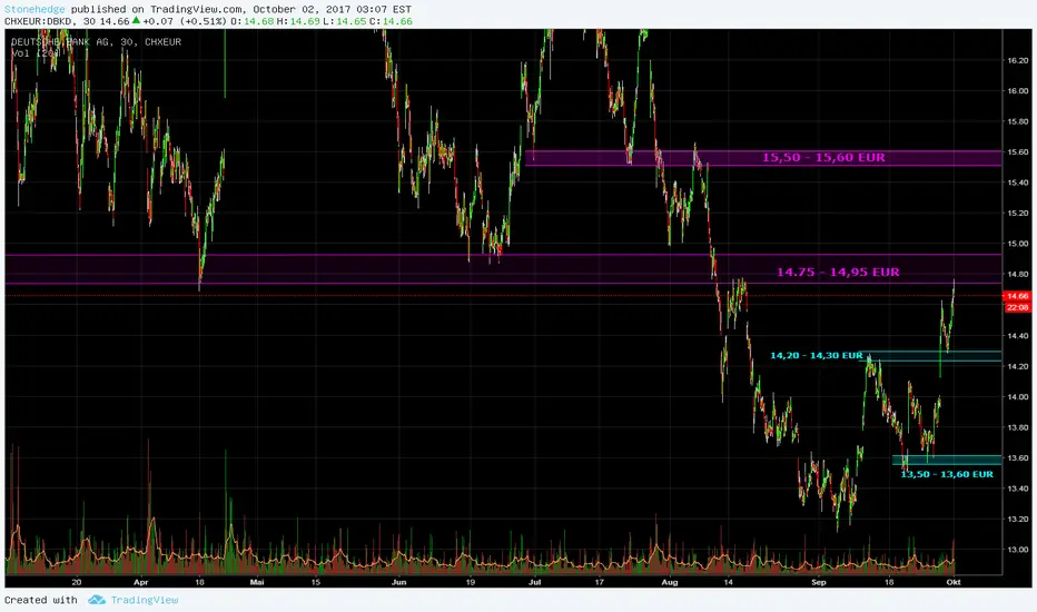 Die Deutsche Bank hat soeben den wichtigen Widerstand zwischen 14,75 und 14,95 Euro erreicht. Hier ist mit einer deutlichen Reaktion nach unten zu rechnen.