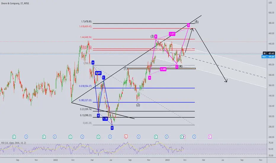 Sollte wie erwartet, die Welle 5 noch folgen, so würden wir ein neues All-Time-High bei John Deere erleben. Gleichzeitig würde sich dadurch ein neues ABCD (pink) ausbilden, welches uns wiederum markante Zielmarken für die Shortseite liefert.