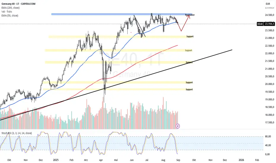der DAX konnte den Widerstand nicht überwinden und läuft somit erstmal wieder Short. Ich hatte ja in der letzten Woche gesagt, dass man unbedingt auf die Reaktion am Widerstand achten sollte.