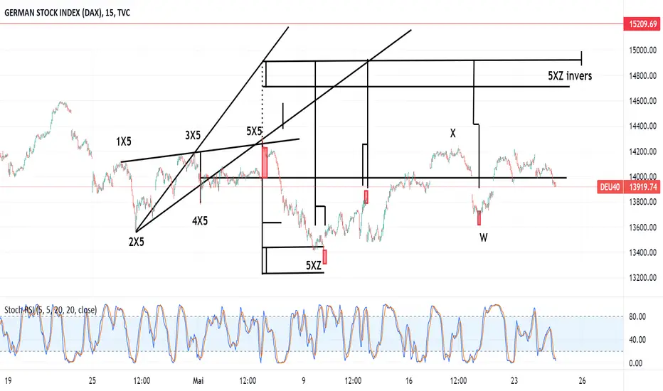 In der Kursgrafik ist im 15 Minuten Zeitrahmen ein bearishes X-Sequentials X5 Muster zu sehen, dass sich vom 26.4.2022 bis zum 5.5.2022 ausbildete. Das 5XZ Tief wurde am 9.5.2022 bei 13380.67 Punkten gehandelt. Der DAX Index stieg in der Folge mit 14226.47 Punkten oberhalb des X-Sequentials "X" Widerstands bei 13990 Punkten an. Das Folgetief "W" lag am 19.5.2022 höher bei 13683.59 Punkten. Steigt der DAX Index oberhalb von Punkt "5X5" an, dann ist ein weiterer Kursanstieg bis in die inverse X-Sequentials 5XZ Kurszielzone bei 14705 Punkten bis 14915 Punkten zu erwarten. Diese Kurszielzone sollte idealerweise am 25.5.2022 erreicht werden. Damit diese Prognose eintreffen kann, muss der DAX Index nun in den nächsten Sitzungen Punkt "5X5" bei 14315.24 Punkten überbietet. Nach anschließendem Überbieten der oberen Begrenzung der zuvor erwähnten Kurszielzone bei 14915 Punkten, ist mit einem weiteren Kursanstieg bis 15200 Punkten zu rechnen.