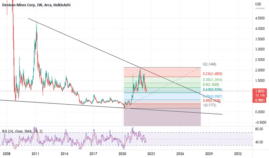 Dension Mines arbeitet aktuell in einer vermutbaren bullishen Wolfe Wave und hat diese noch nicht aktiviert... Hier vermute ich nochmal eine ordentliche Ausspülug bis auf ein Minimum... Enstiegslevels werden erst dann interessant, wenn das 61er Retracement den Test besteht, ansonsten vermute ich den Anlauf an die untere Keiltrendlinie.