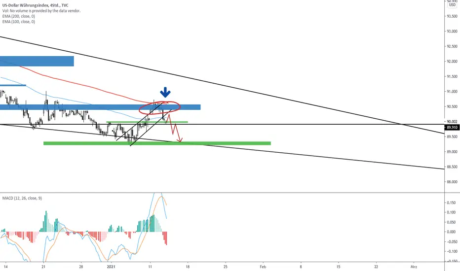 Beim DXY sehen wir auf Tagesbasis eine extrem bearishe Kerze. Ich für meinen Teil warte noch auf Bruch des Supports bei 89.900.