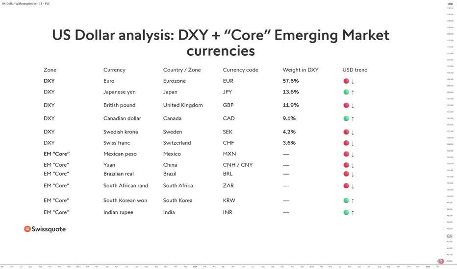 Es erscheint mir daher sinnvoll, in die Analyse auch die wichtigsten Schwellenländerwährungen einzubeziehen, die sogenannten „Core“-Währungen wie den chinesischen Yuan oder die indische Rupie. In dieser Analyse schlage ich eine Tabelle vor, die den übergeordneten Trend des US-Dollars anhand des DXY sowie gegenüber den sechs wichtigsten sogenannten Schwellenländerwährungen zusammenfasst.