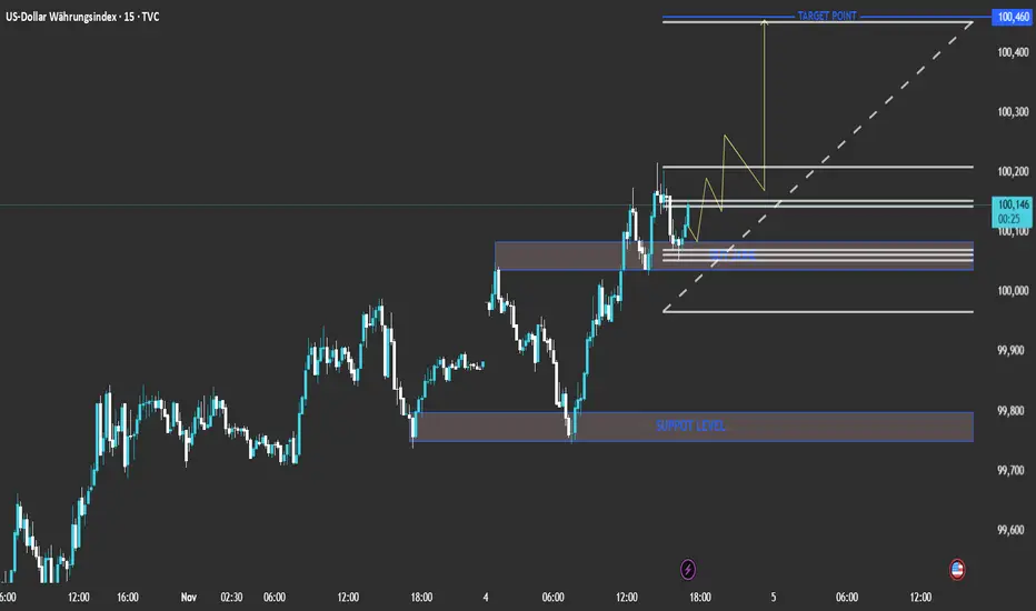 Dollar-Index befindet sich derzeit bei 100.112 und zeigt eine bullische Struktur mit höheren Hochs und höheren Tiefs. Nach einer kurzfristigen Korrektur hat der Kurs im Bereich der 100.00-Zone Unterstützung gefunden und könnte nun eine weitere Aufwärtsbewegung einleiten.