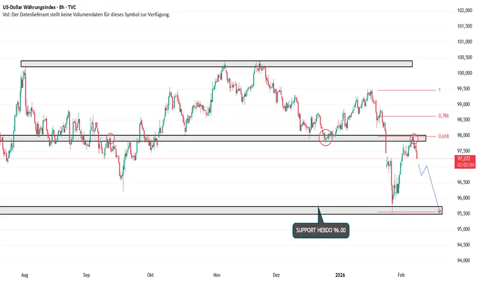 Der Dollar-Index (DXY) zeigt derzeit eine geschwächte Struktur, nachdem er eine wichtige Retracement-Zone um 98,0–98,2 abgewiesen hat, die mit dem Fibonacci-Level 0,618 und einem ehemaligen Supportbereich übereinstimmt, der nun als Widerstand fungiert.