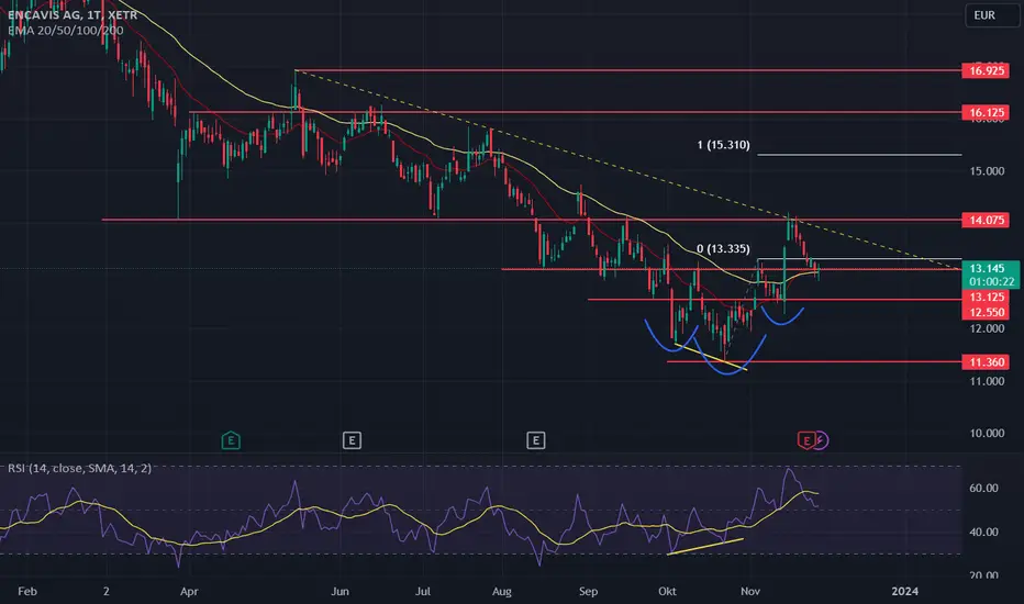 Encavis arbeitet derzeit an einem kleinen Boden. EMA20 & EMA50 haben sich im 1D bereits gekreuzt. Die oben genannte Marke von 14.075€ wurde bereits ein erstes Mal angelaufen. Zur Zeit handelt die Aktie an der wichtigen Unterstützung von 13.23€. Schwieriger für die Bullen wird es, wenn auch das Swinglow bei 12.275€ unterschritten wird.