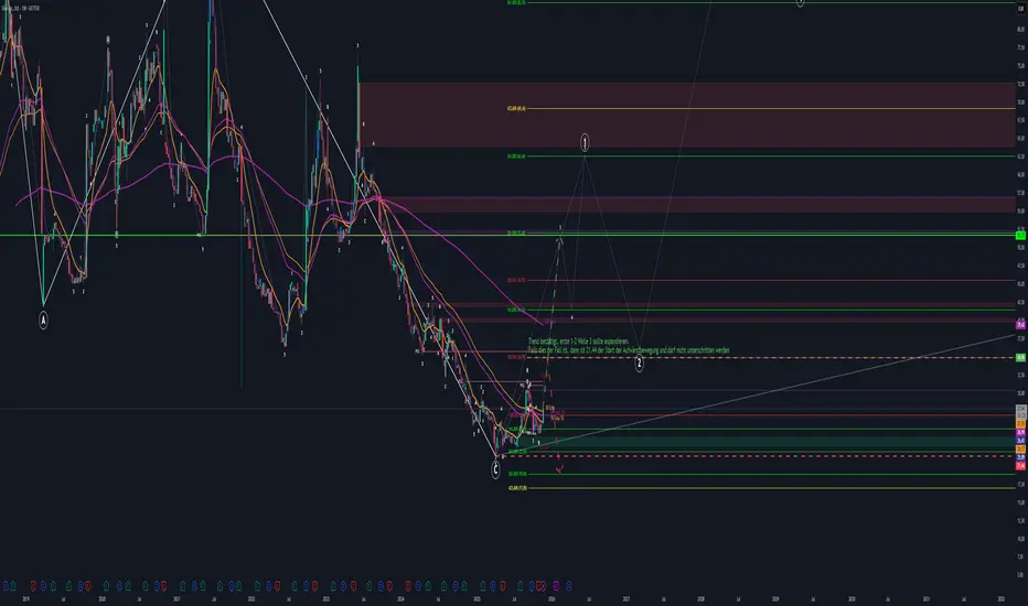 Die gesamte Struktur ist seit 2021 ein korrigierender, überlappender Downtrend mit einer möglichen A-B-C-Struktur, deren C-Welle möglicherweise abgeschlossen ist – aber: