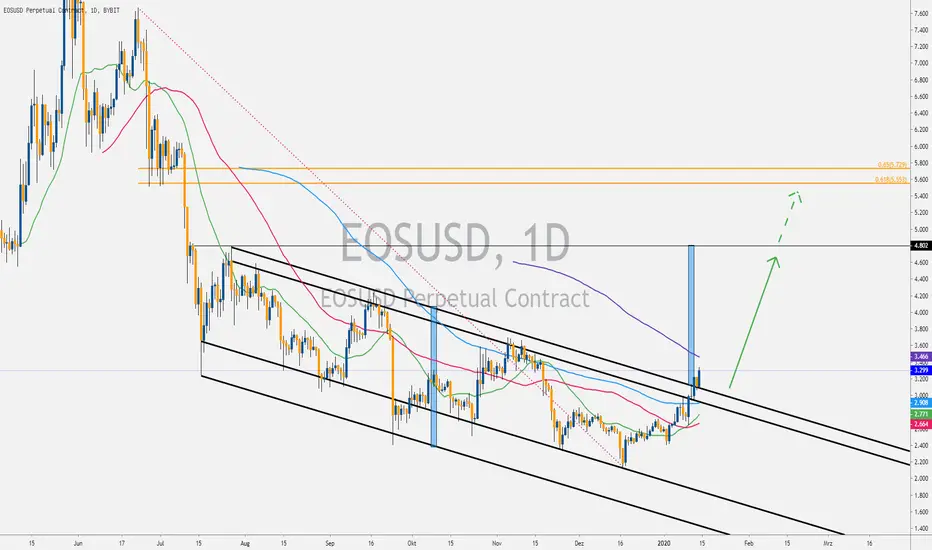 Wer sich den EOS Chart anschau, wird recht schnell feststellen, das Kursgeschehen wurde lange Zeit von einem Abwärtstrend bestimmt. Dieser Trend manifestierte sich in einem Trendkanal, der jetzt über 179 Tage das Geschehen bestimmt hatte.