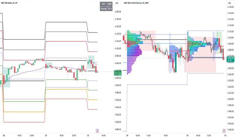 SPX + ES_F - In der Initial Balance scheiterte der Future am Overnight-Session-High und korrigerte die ganze IB-Höhe und versucht aktuell auszubrechen. Ein Fall unter dem Vortagsschluss könnte die Abwärtsreise fortsetzen.