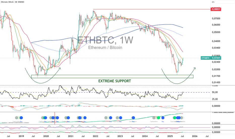 Die Zyklen der relativen Stärke zwischen dem Bitcoin-Kurs und dem Ether-Kurs sind Zyklen von mehreren Jahren, 5 bis 6 Jahre. Die technische Analyse hebt das Vorhandensein einer historischen extremen charttechnischen Unterstützung hervor, die in den letzten Wochen eine bullische Umkehr des ETH/BTC-Kurses ermöglicht hat. Fazit: Es ist nun das Ether-Token, das den Bitcoin-Kurs übertreffen wird, und das dürfte bis zum Ende des aktuellen Zyklus, d.h. bis Oktober/November nächsten Jahres, so bleiben.