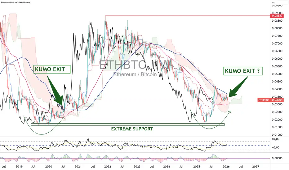 Auf dem Wochenchart bewegt sich das ETH/BTC-Ratio seit mehreren Monaten innerhalb der Ichimoku-Wolke, nachdem es auf einer langfristigen Unterstützungszone Halt gefunden hat, die seit 2019 mehrfach verteidigt wurde. Diese Zone stellt eine extreme Unterstützung dar und unterstreicht ihre technische Relevanz.