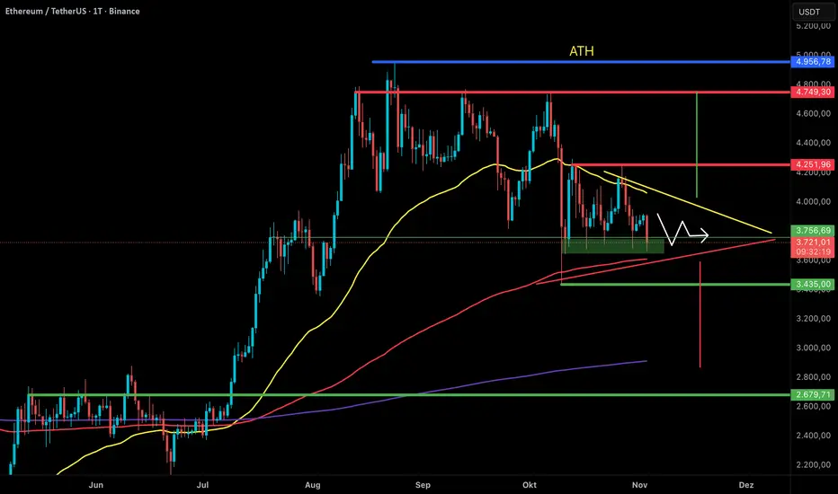 Der Kurs wird aktuell regelrecht zwischen der 50er und 200er EMA „eingeklemmt“. Solche Phasen enden meist mit einer klaren Richtungsentscheidung. Typischerweise durchläuft ein symmetrisches Pattern etwa zwei Drittel seiner Formation, bevor es zu einem Ausbruch kommt. Sollte sich Ethereum also bis Mitte November nicht entscheiden, könnte dann ein dynamischer Move folgen.