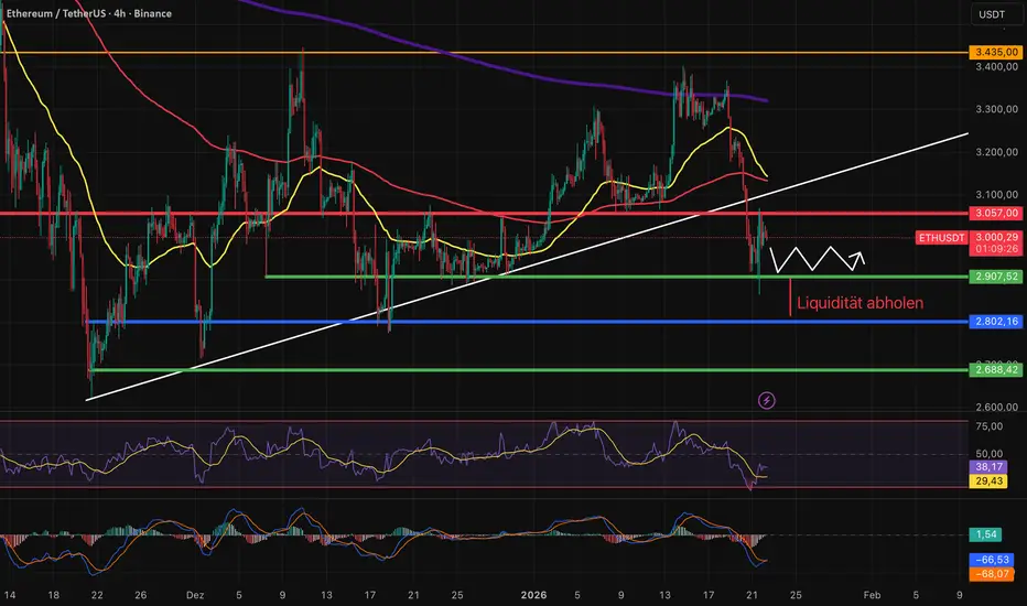 Für Ethereum bleibt der Bereich um 2.907 $ entscheidend. Diese ehemalige Dezember-Konsolidierung muss zwingend verteidigt werden. Ein Bruch darunter würde das kurzfristige Bild weiter eintrüben und den Fokus stärker auf tiefere Liquiditätszonen lenken. Geduld, Risikokontrolle und das übergeordnete Marktumfeld bleiben aktuell wichtiger als jedes einzelne Signal.