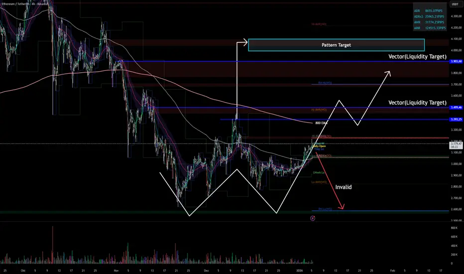Aktuell bildet Ethereum auf dem 4-Stunden-Chart ein W-Pattern. Dabei gibt es zwei wichtige Liquidity Targets sowie ein übergeordnetes Pattern-Target. Solange der Preis nicht deutlich über 2700 hinausläuft, bleibt das Pattern gültig.
