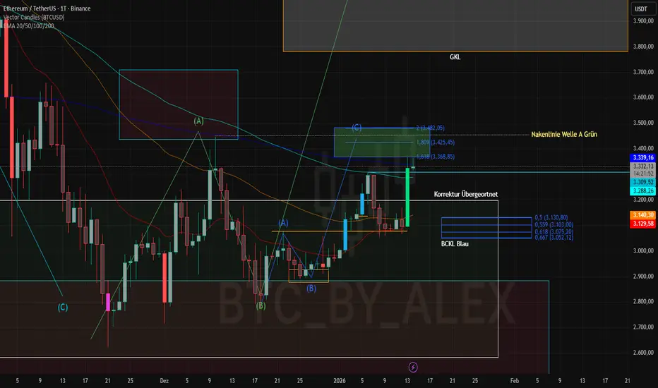 In der Folge gehe ich davon aus, dass lediglich eine BC-Korrektur ansteht. Der technische Grund dafür liegt im Daily-Chart, wo sowohl der 50er als auch der 100er Daily EMA in diesem Bereich verlaufen und als dynamische Unterstützungszone fungieren.