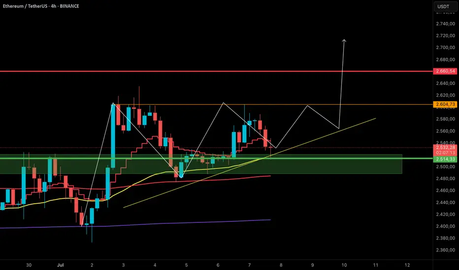 Ein Ausbruch über die obere Begrenzung des Dreiecks, also über die Widerstandszone bei ca. 2.660 $ (rote Linie), könnte den nötigen Impuls für eine dynamische Fortsetzung nach oben liefern. Das Volumenverhalten rund um den Breakout wird entscheidend sein, um die Bewegung zu bestätigen.