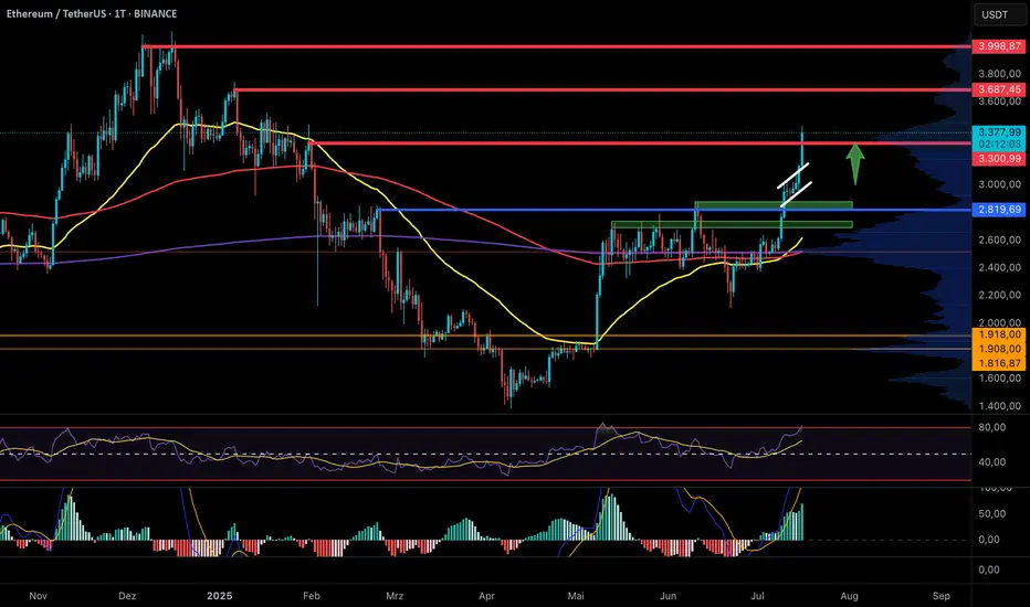 Ethereum verzeichnete eine außergewöhnlich starke Tagesperformance mit einem Kursanstieg von rund 10 % in nur einer Kerze – ein deutliches Zeichen von Momentum und Käuferdominanz. Besonders bemerkenswert: Der Kurs konnte nicht nur die obere Begrenzung des vorherigen aufsteigenden Kanals hinter sich lassen, sondern auch den markanten Widerstandsbereich bei 3.300 USD nachhaltig überwinden.