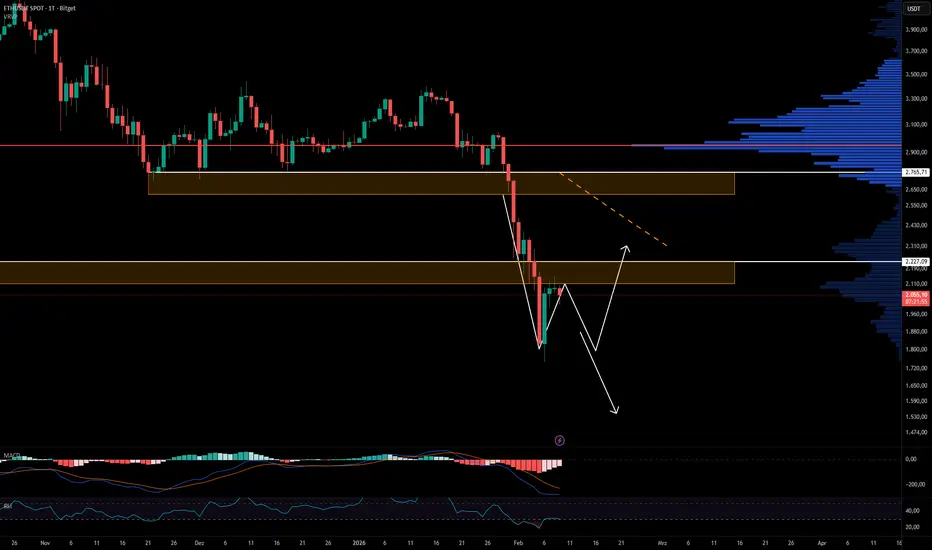In diesem Bereich ist eine Rejection technisch gut nachvollziehbar. Sollte sich der Widerstand bestätigen, besteht die erhöhte Wahrscheinlichkeit, dass der Markt erneut die zuvor gebildete Kaufzone bei ca. 1.800 USD anläuft. Dieses Verhalten passt zur aktuell fragilen Marktstruktur.