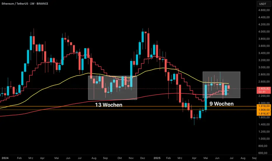Ethereum befindet sich auf dem Wochenchart bereits seit neun Wochen in einer ausgeprägten Seitwärtskonsolidierung knapp unterhalb der 50er Weekly EMA. Trotz mehrfacher Versuche gelang es dem Kurs bislang nicht, diesen gleitenden Durchschnitt nachhaltig zu überwinden – ein klarer technischer Widerstand, der weiterhin den übergeordneten Aufwärtsimpuls ausbremst.