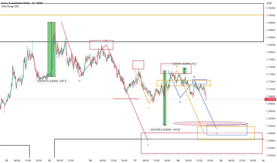 Die Anfängliche Länge der großen, roten 0A-Bewegung beträgt ca 147 Pips. Diese Range darf der Markt nun aus dem zweiten roten Rechteck (BC) nutzen um ein neues Low zu generieren.