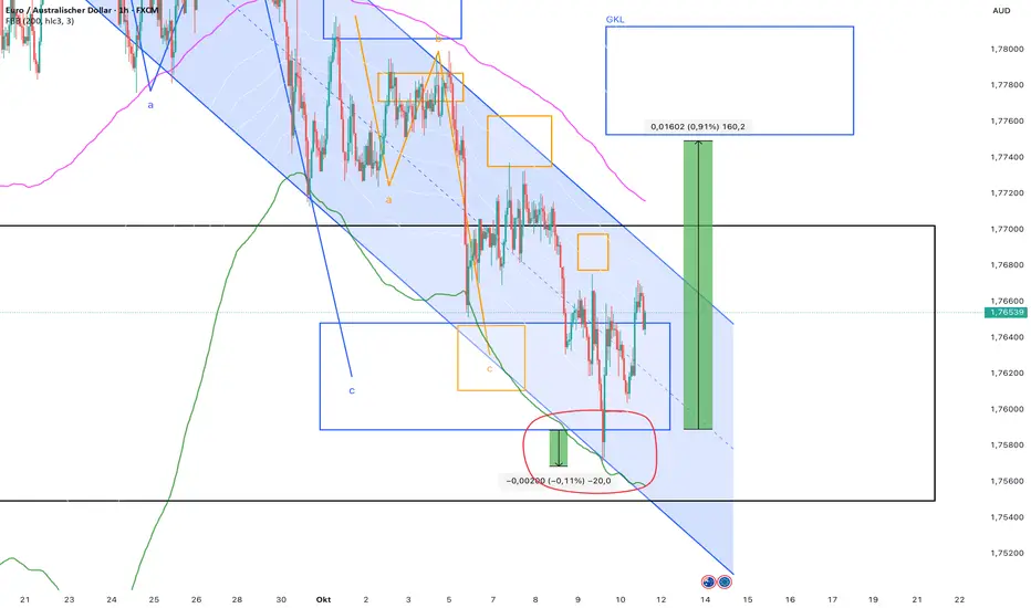 Der Markt bestätigt die bärische Überhand jedoch durch das anlaufen des bärischen GKL's in rot mit früher, Range-Losen Reaktion. Daraus ergibt sich nun die bekannte, saubere bärische Sequnz in blau.