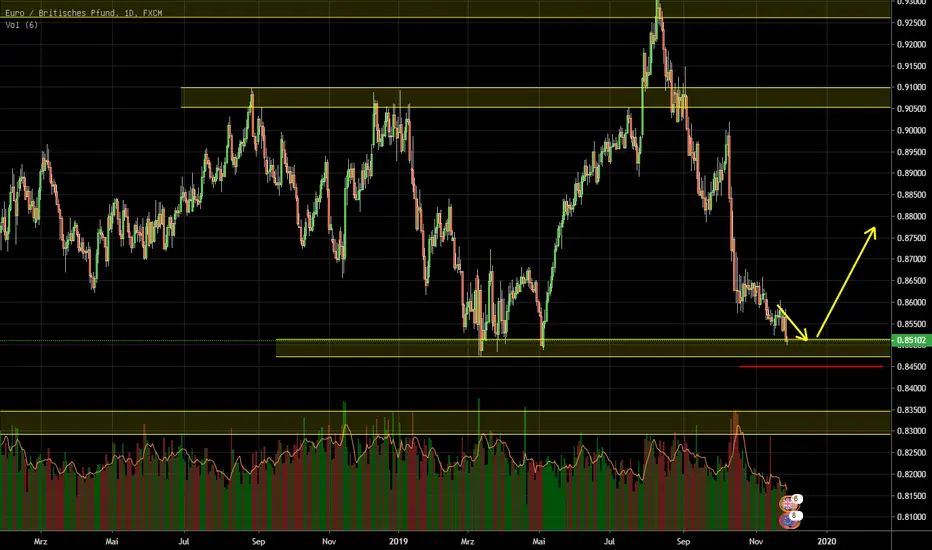 Das Währungspaar befindet sich an der wichtigen Unterstützung im Bereich 0,847 - 0,8513 GBP. Hier erwarte ich eine Gegenbewegung bis 0,88 GBP, was bei einem Stop-Loss unter der Unterstützung, ein gutes Chance-Risiko-Verhältnis ergibt.