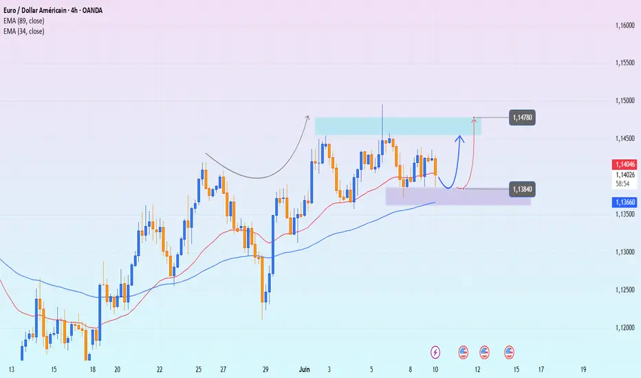 Après une légère correction, l’EURUSD tente de se maintenir autour de la zone de support des 1.13840 – qui coïncide avec l’EMA89 et une zone de réaction de prix marquée par le passé. Bien qu’aucune cassure claire ne soit encore visible, l’action du prix récente montre un effort pour préserver la structure haussière, les creux successifs restant intacts.