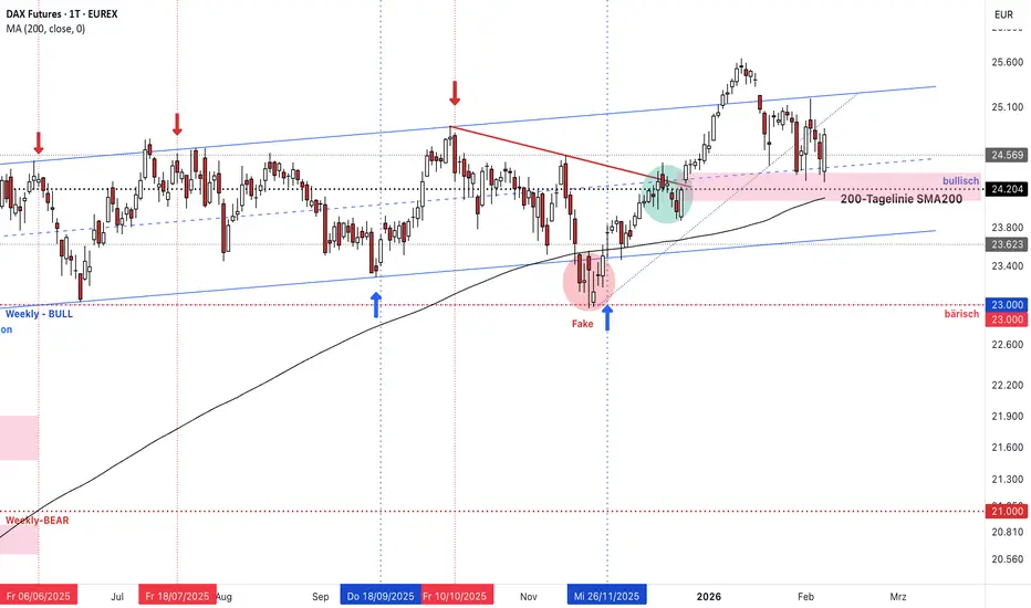 Wichtig für uns ist vor allem eins: die bullische Handelsmarke bei 24200 hält und der DAX wird gekauft. Für uns ist der Trend noch in Ordnung und kann durchaus wieder zu steigenden Kursen führen und ist ein guter Einstiegsmoment. Aber Vorsicht, wenn die rote Zone um die bullische Handelsmarke fällt, dann wechseln wir sofort von bullisch auf neutral.