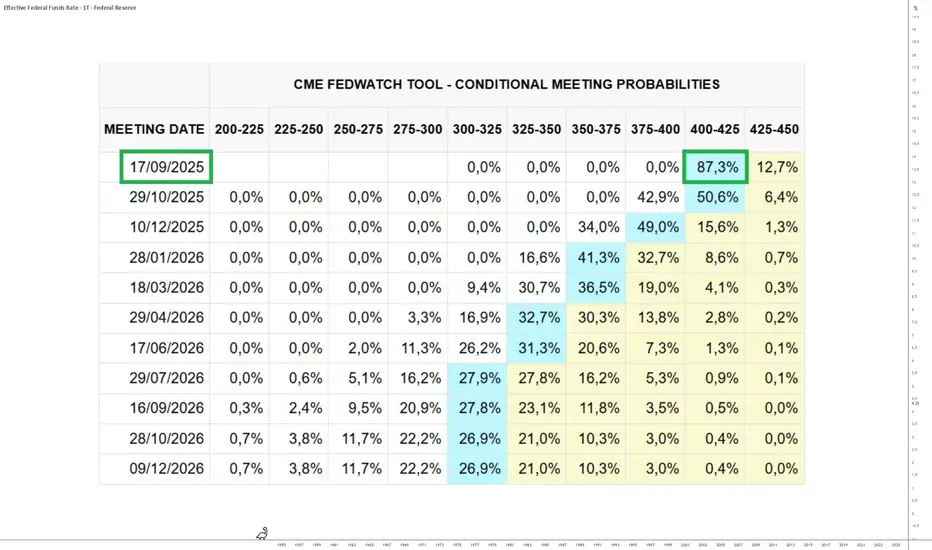 Zum gegenwärtigen Zeitpunkt und gemäß dem CME FED WATCH TOOL liegt die implizite Wahrscheinlichkeit einer Zinssenkung am 17. September bei 85%.