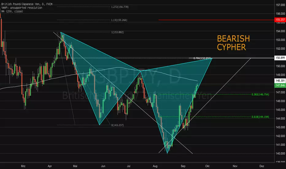 Das bärisches Cypher Pattern hat den Einstiegspunkt D bei 150.90. Stops (XA FIb Inversion) und Ziele (38,2% und 61,8% Retracement) sind ebenfalls eingezeichnet.