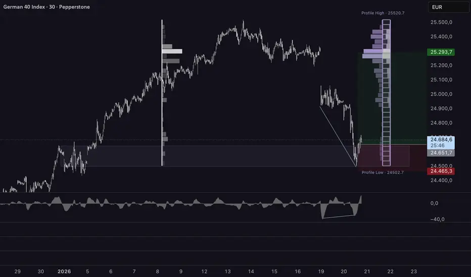 Beim übergeordneten Long Trend sehen wir eine eher starke Demand-Zone, welche in ein neues Hoch geführt hat. Der Preis kommt in die Zone zurück und wir gehen nun Long, nachdem wir eine bullishe Reaktion und eine Divergenz im MACD hatten. Zudem haben wir das Delta Volumen an der oberen Range, welches auch als Magnet wirken kann, da evtl. noch Positionen abgewickelt werden müssen.