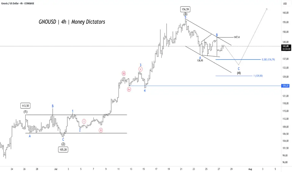 Das Währungspaar GNO/USD entwickelt auf dem 4-Stunden-Chart eine klare Elliott-Wellen-Impulsstruktur. Die Aufwärtsbewegung begann mit Welle (1), die bei 113,50 ihren Höhepunkt erreichte, gefolgt von einer korrektiven Welle (2), die nahe 105,28 ihren Tiefpunkt fand. Dies bereitete den Boden für eine kraftvolle Welle (3), die bis auf 156,59 anstieg – ganz im Einklang mit der Elliott-Wellen-Theorie, wonach Welle 3 typischerweise der stärkste und steilste Abschnitt im Zyklus ist.