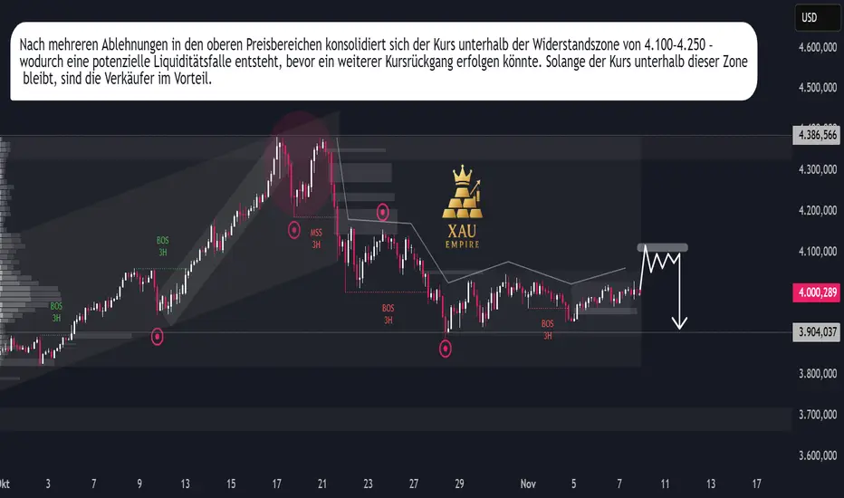 Gold zeigt nach der jüngsten Korrektur Anzeichen von Schwäche. Die Marktstruktur im 3-Stunden-Chart verdeutlicht ein klares Verteilungsmuster, da der Preis weiterhin an der Angebotszone zwischen 4.100 und 4.250 abprallt. Wiederholte Brüche der Kursstruktur (BOS) signalisieren, dass die Abwärtsdynamik dominant bleibt.