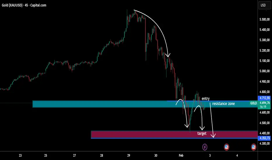 Der Chart zeigt einen sauberen Support-zu-Resistance-Flip nach einem starken Abverkauf. Solange der Preis unter der markierten Widerstandszone bleibt, ist der wahrscheinlichste Weg nach unten in Richtung der unteren Nachfragezone.