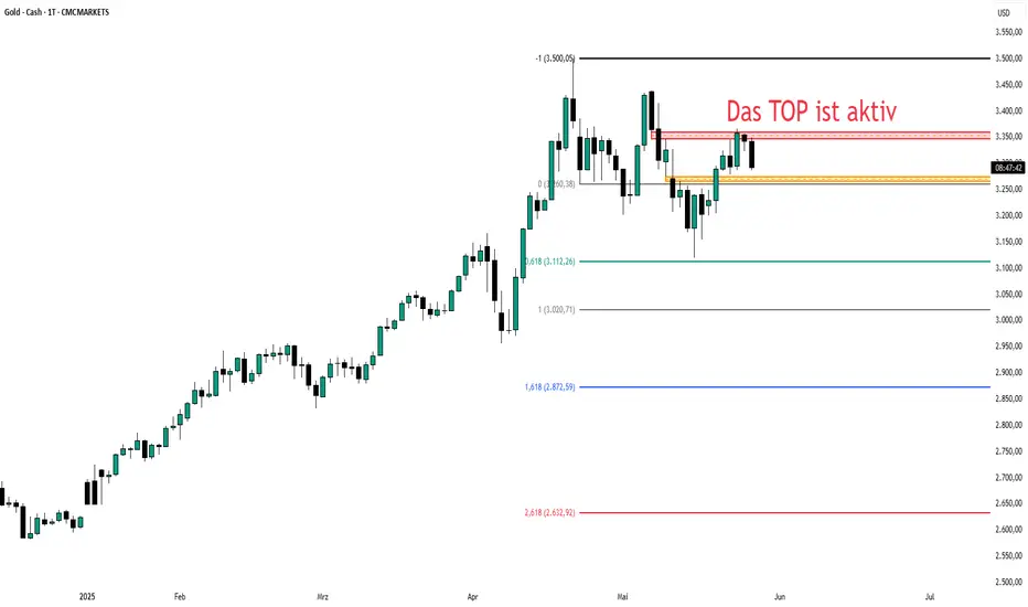 Gold hat ein 123-Top ausgebildet, als es am 12. Mai unter 3260 Dollar schloss und am Folgetag mit einem Fair Value Gap (orange) aktiviert wurde. Das erste Ziel (61,8% bei 3112 USD) ist erreicht. Es folgt ein Bounce, der das Fair Value Gap testet, das die Aktivierung des 123-Tops einleitete (rot).