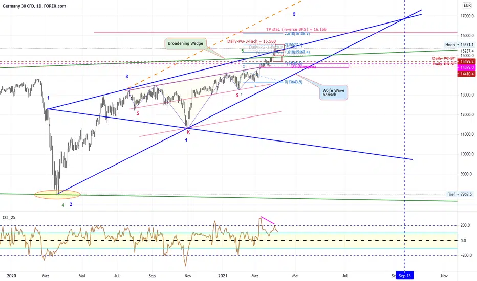 - Der CCI-Indikator im Daily zeigt eine bärische Daily-Divergenz an, deren Rücklaufzone ab ca. 14.590 beginnt (Magenta).