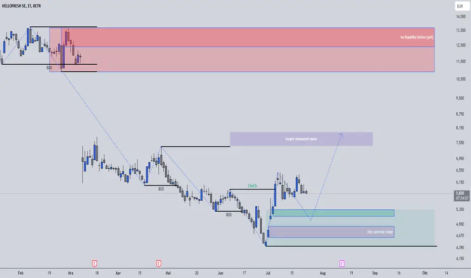 Seit dem letzten Update ist schon ein Monat vergangen. HelloFresh hat (wie erwartet) eine bärische Korrektur (orange) gestartet. Die Korrektur wurde explosiv bullisch aufgelöst indem das letzte Hoch um 8€ erreicht wurde. Im Moment sehe ich nicht viel Struktur in der Aufwärtsbewegung, wer drin ist bleibt drin oder nimmt Gewinne mit, wer auf das Ende der orangen Korrektur gewartet hat ist vermutlich enttäuscht, weil man praktisch nicht long einsteigen konnte (Aufwärtslücke). Das letzte Swing High um 8€ ist Stand heute noch nicht gebrochen! Eventuell kommt eine weitere Korrektur (die sogar nochmal unter 6.5€ gehen kann) oder die Kurse steigen weiter und brechen das Hoch.