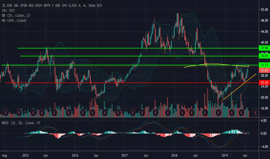 JD.com macht sich bereit zum großen Sprung. Ich habe mal das große Bild aufgemacht. Der 5-Jahreschart zeigt, dass die Aktie an einem interessanten Bereich notiert. Gelingt der Break der 30/31 USD, kann es bis zur 35 USD-Marke ganz fix gehen. Aufmerksam geworden auf die Aktie bin ich durch einen Artikel über das Open Interest bei den Call-Optionen. Eine große Anzahl Trader und Investoren haben ihre 31er Calls offenbar in den letzten Tagen zu den 35-er Calls hochgerollt (alles in USD). Das ist kein Freilos, aber es zeigt eine mögliche bullishe Tendenz. Außerdem können Trader bei der Aktie mit knappem Stopp agieren.
