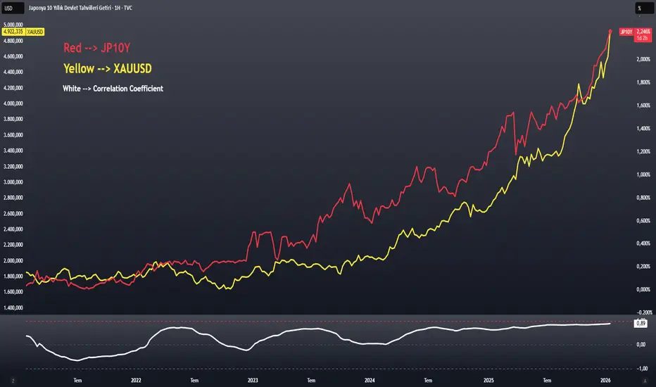 JP10Y yükselince yatırımcılar şunu düşünüyor: carry trade riski artıyor, piyasalarda belirsizlik artabilir ve güvenli limana kaçmam gerekebilir. Ayrıca JP10Y yükselince Japon Yeni güçleniyor, güçlü Yen dolara baskı yapıyor ve zayıf dolar altını yukarı itiyor çünkü altın dolar cinsinden fiyatlanıyor.