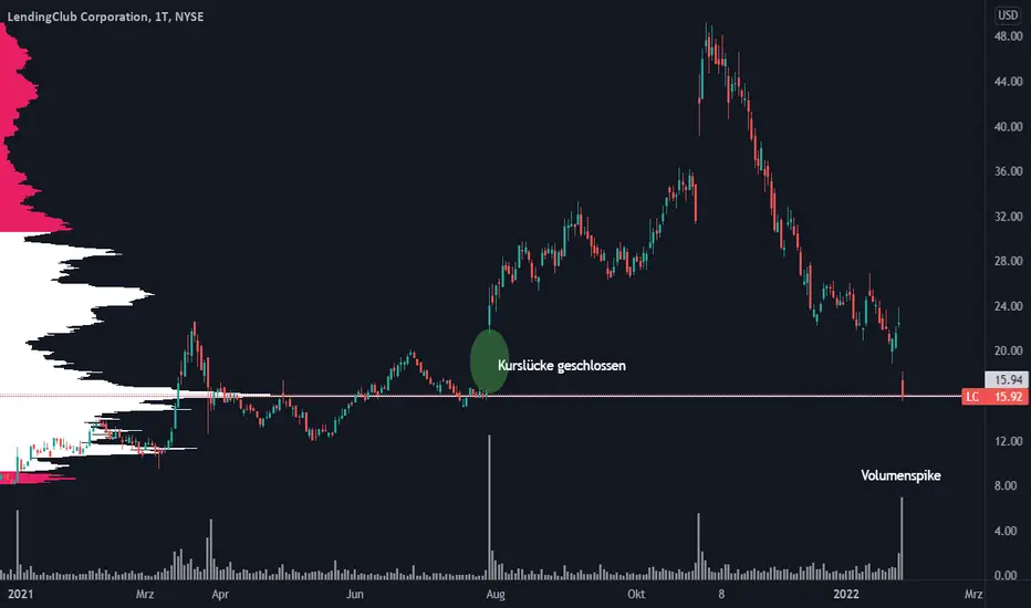 Nach den gestrigen Zahlen hat die Lending Club Aktie fast 30% verloren. Damit wurde eine wichtige Kurslücke auf der Unterseite geschlossen. Nun notiert die Aktie am Point-of-Control. Zusätzlich dazu ist der Volumenspike am gestrigen Handelstag deutlich erkennbar. Zusammenfassend lässt sich festhalten, dass die genannten Tatsachen (Kuslücke geschlossen, POC & Volumenspike) dafür sprechen könnten, dass wir von dem aktuellen Preisniveau bei ~ 16$ eine Erholung in die Long Richtung sehen könnten. Es bleibt daher sehr spannend was heute, am letzten Handelstag der Woche, passieren wird.