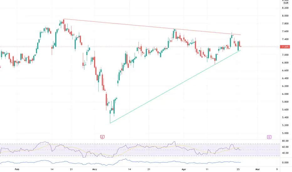 Im Lufthansa-Chart auf H4 ist aktuell ein schönes symmetrisches Dreieck zu erkennen. Wir legen uns an beide Trendlinien einen Alarm.
